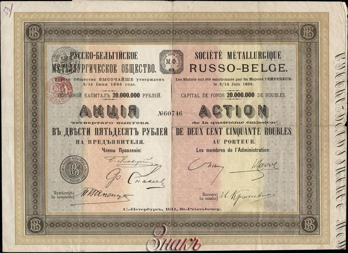 | Keywords: 1911. Акция РБМО. Лицевая сторона.jpg Акция Русско-Бельгийского металлу гического общества http //enr dn ua/ p 3500 1911 Русско-Бельгийское металлу гическое общество PD-RusEmpire Stock certificates of Russian-Belgian metallurgical society Files uploaded by Andrew Butko from various sources 20th century |