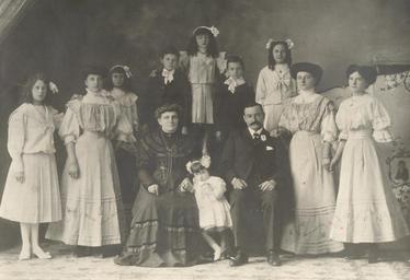 Keywords: Tomada en Punta Arenas, con 10 hijos (dos ya habían fallecido). Los trajes denotas la edad, la mayor llevaba el vestido más largo y así sucesivamente. De izquierda a derecha adelante Pierina Turina Turina, Ana Turina Turina, Isabel (Elizabeta) Turina Gudac, Josefa (Pepita) Alvina Turina Turina (la pequeña), Juan (Joannes) Turina Baretic, Ramona Turina Turina, María Turina Turina. De izquierda a derecha atrás: Isabel Antonieta Turina Turina, Juan Turina Turina, Magdalena Turina Turina, Alfonso Gregorio Turina Turina, Catalina Turina Turina.