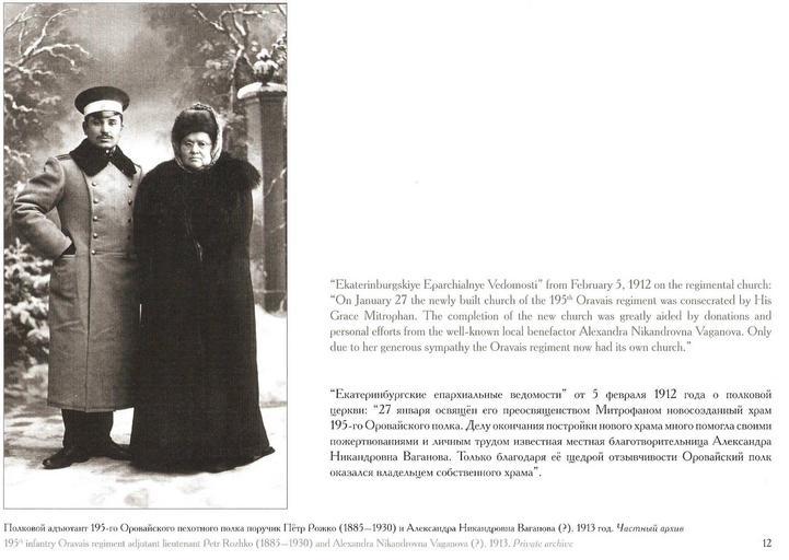 | Keywords: 1913 оровайский полк оровайскийполк скан Полковой адъютант 195-го Оровайского пехотного полка поручик Петр Рожко (1885-1930) и Александра Никандровна Ваганова. 1913 год. Частный архив ......................... Скан из фотоальбома "Екатеринбург. История города в фотографии. Том II", составители А. В. Беркович, О. Ю. Сарафанов, 2015 г. ......................... РОЖКО ПЕТР КАРПОВИЧ (25.08.1885, Полтавская губ. – 13.10.1930, Свердловск) - из крестьян Полтавской губернии, окончил шесть классов Полтавской гимназии и Одесское пехотное юнкерское училище, С 1907 г. подпоручик в Борисовском резервном батальоне (Екатеринбург), с 1910 г. в 195-м Оровайском полку в Екатеринбурге, поручик, с 22 августа 1912 г. полковой адъютант. Участник 1-й мировой войны. Ранен и отравлен газом, награжден всеми орденами, с 15 июня 1917 г. подполковник, начальник хозяйственной части Оровайского полка. 19 мая 1919 г. произведен в полковники и утвержден командиром 27-го Оровайского полка 7-й Уральской дивизии горных егерей. Осенью 1919 г. по болезни находился в Иркутске в резерве чинов округа. С осени 1920 г. по осень 1922 г. служил в РККА, после увольнения проживал в Екатеринбурге и работал инспектором налогового стола. (Кручинин А.М. Российский полк с финским именем. Екатеринбург, 2000, с.159,166; Он же. Сокол Оровайского племени…// Уральская Старина. Вып.4. – Екатеринбург, 2000, с.354-365; Купцов И.В. Челябинск. Июль-август 1919 г. // Неизвестный Челябинск. Краеведческий сборник. – Челябинск, 2002, с.301). "Живой Урал" - www.facebook.com/urallive/photos/pcb.1635196766737429/163... Полковой адъютант 195-го Оровайского пехотного полка поручик Петр Рожко (1885-1930) и Александра Никандровна Ваганова. 1913 год. Частный архив ......................... Скан из фотоальбома "Екатеринбург. История города в фотографии. Том II", составители А. В. Беркович, О. Ю. Сарафанов, 2015 г. ......................... РОЖКО ПЕТР КАРПОВИЧ (25.08.1885, Полтавская губ. – 13.10.1930, Свердловск) - из крестьян Полтавской губернии, окончил шесть классов Полтавской гимназии и Одесское пехотное юнкерское училище, С 1907 г. подпоручик в Борисовском резервном батальоне (Екатеринбург), с 1910 г. в 195-м Оровайском полку в Екатеринбурге, поручик, с 22 августа 1912 г. полковой адъютант. Участник 1-й мировой войны. Ранен и отравлен газом, награжден всеми орденами, с 15 июня 1917 г. подполковник, начальник хозяйственной части Оровайского полка. 19 мая 1919 г. произведен в полковники и утвержден командиром 27-го Оровайского полка 7-й Уральской дивизии горных егерей. Осенью 1919 г. по болезни находился в Иркутске в резерве чинов округа. С осени 1920 г. по осень 1922 г. служил в РККА, после увольнения проживал в Екатеринбурге и работал инспектором налогового стола. (Кручинин А.М. Российский полк с финским именем. Екатеринбург, 2000, с.159,166; Он же. Сокол Оровайского племени…// Уральская Старина. Вып.4. – Екатеринбург, 2000, с.354-365; Купцов И.В. Челябинск. Июль-август 1919 г. // Неизвестный Челябинск. Краеведческий сборник. – Челябинск, 2002, с.301). "Живой Урал" - www.facebook.com/urallive/photos/pcb.1635196766737429/163... |