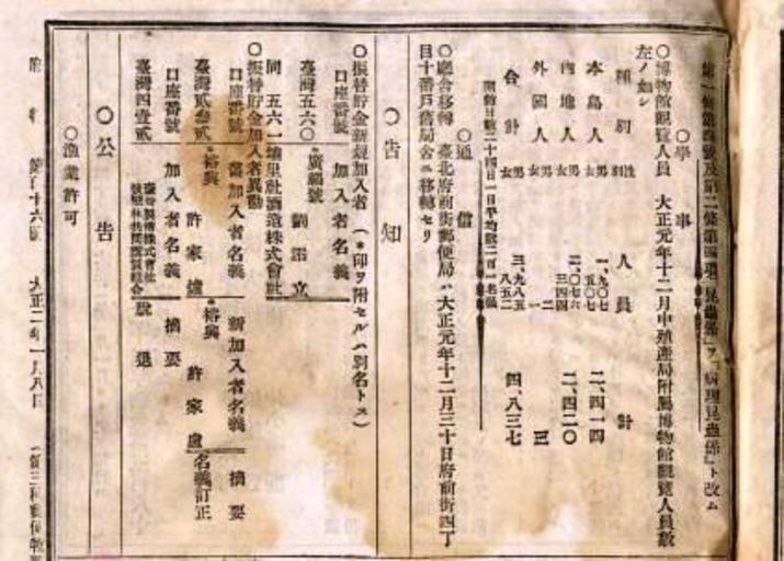 Keywords: 1913 January Gazette of the Governor-General of Taiwan 大正2年1月臺灣總督府報-博物館觀覽人數.jpg zh-tw 1913-01-08 大正元年十二 附屬於殖產 底下之博物館 覽人數統計 2013-10-14 09 30 22 http //catalog digitalarchives tw/item/00/49/0c/2a html Japanese Government PD-Japan-exempt<br>PD-ROC-official Officail text of Government-General of Taiwan Uploaded with UploadWizard Collections of the National Taiwan Museum PD-Japan-exempt PD-1996 Japan |