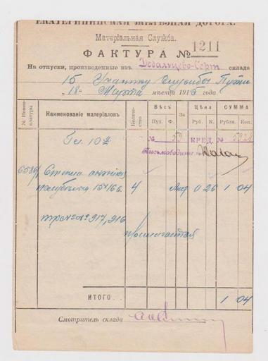 | Keywords: 1915. Фактура Екатерининской железной дороги.jpg Факту а Екате ининской железной до оги Станция Дебальцево-со ти овочная http //forum gp dn ua/viewtopic php f 43 t 870 1915 Екате ининская железная до ога PD-RusEmpire 1915 in Debaltsevo Economy of Debaltseve Documents of Donetsk Oblast |