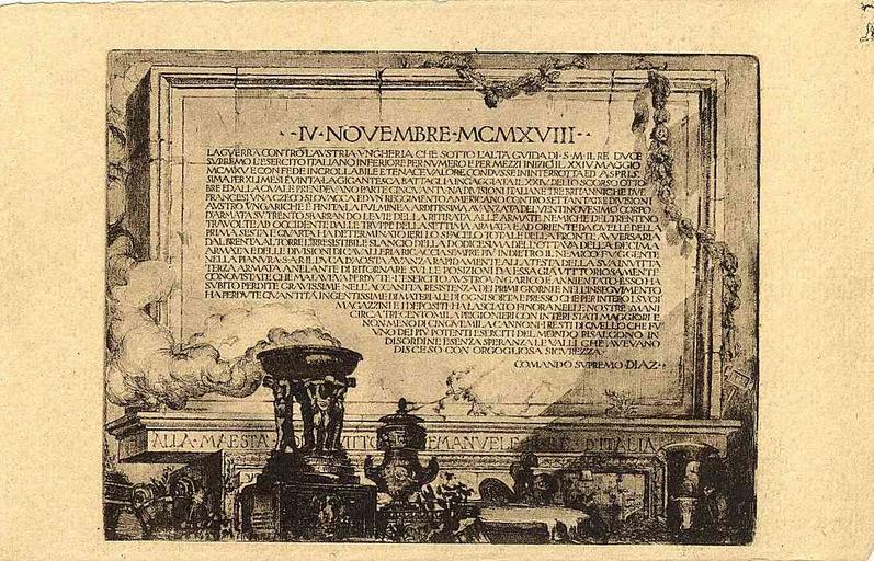 Keywords: 1915-1918-bollettino-della-Vittoria-4-novembre-1918.jpg it Cartolina riproducente il Bollettino della Vittoria del 4 novembre 1918 - da un'acquaforte di G Greppi - pro monumento per i Caduti - timbro della Associazione Nazionale dei Combattenti Collezione cartoline Albertomos Albertomos 1918 testo del Bollettino della Vittoria ImageNote 1 242 130 605 346 1093 702 2 4 novembre 1918 Comando Supremo La guerra contro l'Austria Ungheria che sotto l'alta guida di S M il Re duce supremo l'Esercito Italiano inferiore per numero e per mezzi iniziò il 24 maggio 1915 e con fede incrollabile e tenace valore condusse ininterrotta ed asprissima per 41 mesi è vinta La gigantesca battaglia ingaggiata il 24 dello scorso ottobre ed alla quale prendevano parte 51 divisioni italiane 3 britanniche 2 francesi una Czeco Slovacca ed un reggimento americano contro 73 divisioni Austro Ungariche è finita La fulminea arditissima avanzata del 29 Corpo d'Armata su Trento sbarrando le vie della ritirata alle armate nemiche del Trentino travolte ad occidente dalle truppe della 7 armata e ad oriente da quelle della 1 6 e 4 ha determinato ieri lo sfacelo totale del fronte avversario Dal Brenta al Torre l'irresistibile slancio della 12 della 8 della 10 armata e delle divisioni di cavalleria ricaccia sempre più indietro il nemico fuggente Nella pianura S A R il Duca d'Aosta avanza rapidamente alla testa della sua invitta 3 armata anelante di ritornare sulle posizioni da essa già vittoriosamente conquistate L'Esercito Austro Ungarico è annientato esso ha subito perdite gravissime nell'accanita resistenza dei primi giorni e nell'inseguimento ha perduto quantità ingentissime di materiali di ogni sorta e pressoche per intero i suoi magazzini e i depositi Ha lasciato finora nelle nostre mani circa 300 000 prigionieri con interi stati maggiori e non meno di 5 000 cannoni I resti di quello che fu uno dei più potenti eserciti del mondo risalgono in disordine e senza speranza le valli che avevano disceso con orgogliosa sicurezza Diaz ImageNoteEnd 1 ImageNote 2 184 534 645 40 1093 702 2 ALLA MAESTA' DI VITTORIO EMANUELE III RE D'ITALIA ImageNoteEnd 2 World War I postcards of Italy Bollettino della Vittoria |