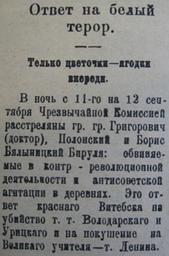 | Keywords: 19180913-newspaper witebsk cheka red terror.gif ru Объявление о асст елах Витебской ЧК к асный те о после покушения на Ленина и убийства У ицкого de Zeitungsartikel der die Durchführung von Erschießungen in Witebsk durch die örtliche Tscheka im Zuge des Roten Terrors nach der Ermordung von Tscheka-Chef Urizky in Petrograd und dem Attentatsversuch auf Lenin verkündet en Newspaper article declaring the bolshevist commitment to red terror after the assassination of Cheka-leader Urizky in Petrograd and the assassination attempt on Lenin http //www vitebsk orthodoxy ru/publicat/paper18 gif author 1918-09-13 PD-old Original upload log page ru wikipedia Paper18 gif Upload date User Bytes Dimensions Comment 2008-10-25 09 38 46 Vikiped 102949 264×400 <small><nowiki> Изоб ажение Описание о к асном те о е newspaper article declaring the bolshevist commitment to red terror Авто unk В емя создания circa 1918 Источник h</nowiki></small> Red Terror Viciebsk |