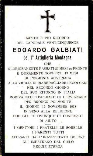 Keywords: 1918-Galbiati-Edoardo-necrologio-b.jpg it MB Monza necrologio di Edoardo Galbiati 1892-1918 uno dei 667 monzesi caduti durante la I guerra mondiale ricordati nel monumento in piazza Trento e Trieste Archivio privato Albertomos 1918-11-17 nessuna Mesto e pio ricordo del caporale venticinquenne EDOARDO GALBIATI del 1° Artiglieria Montagna che gloriosamente passati 29 mesi di Fronte e duramente sofferti 13 mesi di prigionia austriaca alla vigilia di riabbracciare i suoi cari nel secondo giorno del suo ritorno in Italia moriva nell ™Ospedale di Cervignano per Bronco Polmonite il giorno 17 novembre 1918 in seno alla religione che gli fu ovunque di conforto di aiuto I genitori i fratelli le sorelle i parenti tutti affranti dall ™inaspettato dolore gli impetrano dal cielo requie eterna ImageNote 1 36 187 459 656 522 873 2 <center> Mesto e pio ricordo del caporale venticinquenne EDOARDO GALBIATI del 1° Artiglieria Montagna che gloriosamente passati 29 mesi di Fronte e duramente sofferti 13 mesi di prigionia austriaca alla vigilia di riabbracciare i suoi cari nel secondo giorno del suo ritorno in Italia moriva nell ™Ospedale di Cervignano per Bronco Polmonite il giorno 17 novembre 1918 in seno alla religione che gli fu ovunque di conforto di aiuto ---- I genitori i fratelli le sorelle i parenti tutti affranti dall ™inaspettato dolore gli impetrano dal cielo requie eterna </center> ImageNoteEnd 1 Edoardo Galbiati 1892-1918 In memoriam cards |