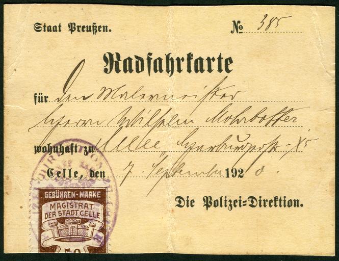 Keywords: 1920-09-07 Radfahrkarte Staat Preußen No. 385 Polizei-Direktion Gebühren-Marke Stadt Celle Magistrat Malermeister Wilhelm Mohrbotter.jpg Radfahrkarte Staat Preußen No 385 mit Vordruck für die 1920er Jahre für Die Polize-Direktion in Celle ausgestellt am 7 September 1920 für Zitat den Malermeister Herrn Wilhelm Mohrbotter wohnhaft zu Celle str - 15 mit vom Magistrat der Stadt Celle gestempelter und etwa halbierter Gebührenmarke zu 50 Pfennig Der Karton mit den Maßen 10cm x ca 7 4cm wurde oben und unten offenbar mit der Schere per Hand durchgeschnitten und - wohl von seinem Besitzer - in der Mitte geknickt Die Rückseite ist blanco mit Resten aufgeklebten Papiers Scan vom Original Bernd Schwabe 1920-09-07 Preußen PD-ineligible PD-old Documents by Ilse Paul Driver's licenses of Germany Wilhelm Mohrbotter painter 1920 in Lower Saxony 1920 documents Bicycles Revenue stamps on documents Revenue stamps of Germany Transport in Prussia Media of Prussia |