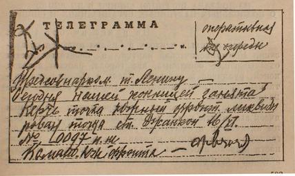 | Keywords: Телеграмма Фрунзе Ленину 1920.JPG Operational telegram from bolshevik military commader Mikhail Frunze to Vladimir Lenin regarding the capture of Kerch-Peninsula and the liquidation of the southern front of Russian Civil War ru Опе ативная телег амма Ф унзе Ленину о взятии Ке чи и ликвидации Южного ф онта п отив В ангеля own photo by Vizu / В огненном кольце Исто ия Отечества в оманах и документах олодая гва дия 1988 Раздел документов Mikhail Frunze 1920-11-16 PD-trivial signature Russia PD-old-70 Signatures of politicians from the Soviet Union Signatures of generals from Russia Mikhail Frunze 19201116 Documents in Russian Civil war of Russia in Crimea 19201116 History of Kerch 1920 in Crimea telegramms Civil war of Russia 1920 |