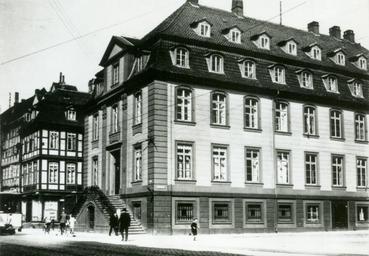 Keywords: 1920 circa Evangelisch-lutherisches Landeskirchenamt Hannover, Königliches Konsistorium am Neustädter Markt, Calenberger Straße 34, Blick in Richtung Rote Reihe.jpg Scan einer Fotografie von einer um 1920 entstandenen Fotografie mit einer Teilansicht des ehemaligen British Hotel zum Zeitpunkt der Aufnahme Sitz des Landeskirchenamts der Evangelisch-lutherischen Landeskirche Hannovers hier der Blick von der Calenberger Straße Ecke Archivstraße in Richtung der Fachwerkhäuser an der Ecke Rote Reihe Rechts neben der aus dem Bild herausfahrenden hannoverschen Straßenbahn ist die dreiachsige schmale Hauptfassade des damaligen Landeskirchenamtes zu sehen mit seiner doppelarmigen Freitreppe und dem schmiedeeisernen Geländer Scan der Vorlage Bernd Schwabe im Wikipedia-Büro Hannover; mit Dank an die Leihgeberin die Evangelisch-lutherische Landeskirche Hannovers Amt für Bau- und Kunstpflege Hannover ~ 1920 unbekannter Fotograf PD-old Wikipedia-Büro Hannover 2016 Documents by Evangelisch-lutherische Landeskirche Hannovers British Hotel Hannover Rote Reihe Hannover Trams in Hannover Hanover Consistory Hanover |
