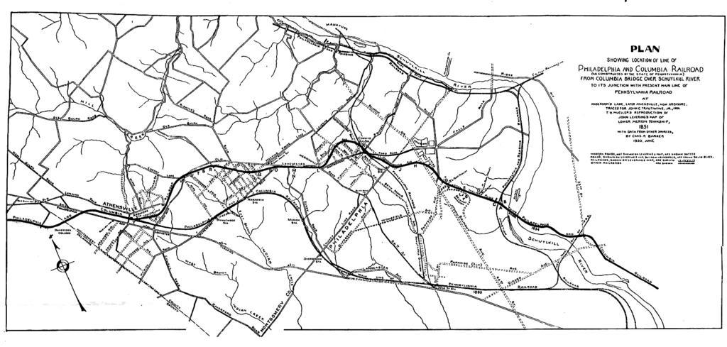 | Keywords: 1920 Philadelphia and Columbia.jpg s of these locations as they existed in 1920 may no longer be accurate A South slope still traceable of embankment on curve leading from Columbia Bridge east of Junction Railway toward the Inclined Plane B On east side of Junction Railway looking west toward that Railway - End of square stringer or tie with long round iron ball bent to a semicircle - Square stone block - These two perhaps in place C Stone tie and three pairs of square stone blocks at south corner of row of dwellings CE Line of inclined plane well marked by excavation and embankment filled with undergrowth but without notable relics Park trolley line occupies stretch D-E F Remains of double track on curve just south of Park trolley track south of Junction station East track on stone stringers; west track on square stone blocks Detached pair of square stone blocks in place near by indicating curve to the right Stringers in vicinity out of place Long grass cut and earth covering removed by order of Mr Alan Carson Chief Engineer to Park Commission G South side of Midvale Ave opposite Methodist Home for the Aged Double track as in F but on tangent HJ From H to J the Columbia R R line followed the present line of Conshohocken State Road now Conshohocken Ave The stone blocks were thrown to the south side of the new highway where they still remain in a line marked by trees and shrubbery JK From J to K the Columbia R R line kept to the west of Conshohocken Ave in part of this distance being directly over the present tracks of the Schuylkill Division of the Pennsylvania R R K East and west slopes of side-hill cuts on east side of excavation of Schuylkill Division Pennsylvania R R and south of highway bridge carrying Montgomery Ave over said division Blue print furnished by Pennsylvania R R Company engineer office shows center line of Columbia R R crossing center line of Schuylkill Division Pennsylvania R R in axis of said highway bridge and near the middle of its length KL From K the Columbia R R line seems to have followed the present line of Bala Ave to about where it now crosses Bryn Mawr Ave Thence it followed a tangent to a point in the rear of the present house of the Union Fire Association Thence it curved to the right passing under the old Ford Road which crossed over the R R on Bowman's Bridge This curve brought the R R line to a tangent at a point L where the line of the south side of Montgomery Ave then called Old Lancaster Road produced reaches what is still called Old Lancaster Road At the N E corner of Ford Road and Parson's Ave Mr J S Parsons has built a corner post containing several of the old square stone R R blocks The changes in roads at Merionville seem to have been roughly as follows - Before the R R abc Old Lancaster Road adef Ford Road But between d and e Ford Road was kinked to dbe in order to make it cross the R R nearly at right angles and de was abandoned the line of Ford Road after the building of the R R thus becoming adbef The portion of db of Ford Road now coincides with the line of Levering Mill Road gdb When Montgomery Avenue was created it took abc from the Old Lancaster Road but later bf was called Mongomery Avenue and bc again became Old Lancaster Road cd is now called Ford Road bc Old Lancaster Road abef Montgomery Ave and gdb Levering Mill Road LO From L to O the Columbia R R line followed the south side of Old Lancaster Road now Montgomery Avenue At M just east of Thourun's Lane which crosses a small run on a bridge of three arches is the south face of an arched stone culvert At N is the Federal Spring Many of the old stone R R blocks are here built into the retaining wall on the south side of Montgomery Ave Beyond O the R R line curved gently to the left P At P the R R line passed over the site of a frame stable building At the SW corver of this stable the top course of a box culvert is seen PQ From P to Q the line easily traceable by pairs of tall trees and by underbrush on the old low embankment follows the south property line of John Albrecht's triangular lot QR Between Q and R the line has been entirely obliterated by the building operations which produced the newer part of Narberth In general the R R line crossed the lines of the present streets at angles of about 45 degrees to its crossing with the present Essex Ave just north of the Narberth Public School Beyond this it probably followed nearly the curve of Essex Ave Stone blocks out of place are seen at the corners of Hamden and Woodbine Aves Woodbine and Narberth Aves and Narberth and Price Aves RS Between R and S remains of a low R R embankment are seen with remains of a box culvert where the line crossed a small run T In a driveway at T are seen well preserved and well exposed 3 pairs of the square stone blocks U At U the R R crossed the Old Lancaster Road now Montgomery Ave which was bent for the purpose crossing the R R at right angles The resulting kink has been removed From U to the east side of Montgomery Ave the line is easily traced by old trees underbrush and the remains of a shallow cut VW From V to a point just east of the Lower Merion High School at W the R R line lies a little to the northward of Montgomery Ave then Old Lancaster Road It was here mostly in shallow excavation where many square stone blocks are still in place The line is easily recognizable from Montgomery Ave by the double line of trees which its presence preserved from destruction WX Between W and X the R R line described a curve of some 75 degrees to the right ending at about the present Thompson Avenue a little south of the east end of Coulter Ave In the yard of Mr Swartz at X is a stone block with chair mark apparently nearly in place From X the R R line lay a little to the south of the present Coulter Avenue probably meeting it and the present main line of the Pennsylvania Railroad where the two now intersect at Y The portion of the Philadelphia Columbia R R from A to Broad and Vine Streets was sold b