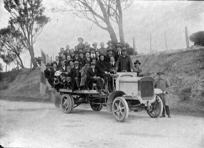 Keywords: tasmania blackandwhite monochrome outdoor black and white City Flour Mills Football team on the way to New Norfolk. G E Rowland photo City Flour Mills Football team on the way to New Norfolk. G E Rowland photo