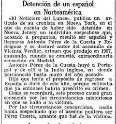 Keywords: 1927-02-15-Vanguardia-detencion-de-un-español-en-Norteamerica.jpg it Articolo di stampa apparso su La Vanguardia del 15 2 1927 in cui si dà notizia dell'arresto in New Jersey di tale Antonio Perez de la Cuesta uno spagnolo che millanta di essere l'assassino di Vicenta Verdier al solo scopo di farsi rimpatriare gratis in patria dalle autorità 1927-02-15 La Vanguardia Barcelona 15 2 1927 pag 23 La Vanguardia DETENCION DE UN ESPAÑOL EN NORTAMERICA El Noticiero del Lunes publica un articolo de su cronista en Nueva York en el que da cuenta de haber sido detenido en New Jersey un individuo sospechoso que acosado a preguntas resultò ser español y llamarse Antonio Perez de la Cuesta y Rodriguez y se declarò autor del asesinato de Vicenta Verdier crimen que se produjo en 1907 causando cuando se cometiò extraordinaria sensacion en Madrid Antonio Perez de la Cuesta huyò a Portugal y de allì a la India inglesa en donde permaneciò hasta mayo del año pasado Dijo que tenia el proposito de regresar a España a fines de este año porque estimaba que ya entonces habria prescrito su crimen Como se recordarà este proceso causò gran sensacion por las circustancias misteriosas en que se hallò a la victima Por las circustancias concurridas nadie habia sospechado que el asesino pudiera ser Perez Cuesta amante que fuè de la victima DETENZIONE DI UNO SPAGNOLO IN NORDAMERICA Il Notiziario del Lunedì pubblica un articolo del suo cronista di New York in cui racconta che un individuo sospetto è stato arrestato in New Jersey che interrogato risultò essere spagnolo e chiamarsi Antonio Perez de la Cuesta e si dichiarò autore dell ™assassinio di Vicenta Verdier delitto commesso nel 1907 provocando a suo tempo straordinaria sensazione in Madrid Antonio Perez de la Cuesta fuggi in Portogallo e da lì andò nelle Indie inglesi dove soggiornò fino a maggio dell ™anno scorso Disse di aver il proposito di ritornare in Spagna alla fine di quest ™anno perché pensava che per allora sarebbe già prescritto il suo crimine Come si ricorderà questo fatto provocò grande sensazione per le circostanze misteriose in cui fu trovata la vittima Date le circostanze nessuno poteva sospettare che l ™assassino potesse essere Perez Cuesta che fu amante della vittima n d r che fu amante della vittima è una notizia priva di fondamento PD-old La Vanguardia news 1927 El crimen de la calle de los Tudescos Madrid 1927 in Spain Uploaded with UploadWizard |