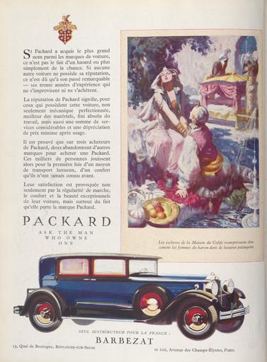 | Keywords: 1930 vogue bibliothèque nationale de france bibliothèquenationaledefrance bnf gallica français национальная библиотека франции национальнаябиблиотекафранции иллюстрированный журнал иллюстрированныйжурнал мода и автомобиль модаиавтомобиль история моды историямоды история рекламы историярекламы packard Si Packard a acquis le plus grand nom parmi les marques de voiture, ce n’est pas le fait d’un hasard ou plus simplement de la chance. Si aucune autre voiture ne possede sa reputation, ce n’est du qu’a son passe remarquable — ses trente anne’es d’expérience qui ne s’improvisent ni ne s’achetent. La reputation de Packard signifie, pour ceux qui possedent cette voiture, non seulement mécanique perfectionnée, meilleur des materiels, fini absolu du travail, mais aussi une somme de services conside’rables et une depreciation de prix minime apr‘es usage. Il est prouvé que sur trois acheteurs de Packard, deux abandonnent d’autres marques pour acheter une Packard. Ces milliers de personnes jouissent alors pour la premiere fois d’un moyen de transport luxueux, d’un confort qu’ils n’ont jamais connu avant. Leur satisfaction est provoquée non seulement par la régularité de marche, le confort et la beauté exceptionnels de leur voiture, mais surtout du fait qu’elle porte la marque Packard. PACKARD ASK THE MAN WHO OWNS ONE Les esclaves de la Maison du Calife transportaient doucement les femmes du harem dam de luxueux palanquins. SEUL DISTRIBUTEUR POUR LA FRANCE : BARBEZAT 13, Quai de Boulogne, BOULOGNE-SUR-SEINE et 102, Avenue des Champs-Elysées, PARIS. gallica.bnf.fr/ark:/12148/cb343833568/date1930 Si Packard a acquis le plus grand nom parmi les marques de voiture, ce n’est pas le fait d’un hasard ou plus simplement de la chance. Si aucune autre voiture ne possede sa reputation, ce n’est du qu’a son passe remarquable — ses trente anne’es d’expérience qui ne s’improvisent ni ne s’achetent. La reputation de Packard signifie, pour ceux qui possedent cette voiture, non seulement mécanique perfectionnée, meilleur des materiels, fini absolu du travail, mais aussi une somme de services conside’rables et une depreciation de prix minime apr‘es usage. Il est prouvé que sur trois acheteurs de Packard, deux abandonnent d’autres marques pour acheter une Packard. Ces milliers de personnes jouissent alors pour la premiere fois d’un moyen de transport luxueux, d’un confort qu’ils n’ont jamais connu avant. Leur satisfaction est provoquée non seulement par la régularité de marche, le confort et la beauté exceptionnels de leur voiture, mais surtout du fait qu’elle porte la marque Packard. PACKARD ASK THE MAN WHO OWNS ONE Les esclaves de la Maison du Calife transportaient doucement les femmes du harem dam de luxueux palanquins. SEUL DISTRIBUTEUR POUR LA FRANCE : BARBEZAT 13, Quai de Boulogne, BOULOGNE-SUR-SEINE et 102, Avenue des Champs-Elysées, PARIS. gallica.bnf.fr/ark:/12148/cb343833568/date1930 |