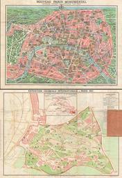 | Keywords: 1931 Leconte Map of Paris w-Monuments and Map of the Exposition Coloniale - Geographicus - Paris-leconte-1931.jpg This is an extremely attractive 1931 tourist pocket map of Paris France Covers the old walled city of Paris and the immediate vicinity Drawn in a lavish art deco style with important buildings are shown in profile including the Eiffel Tower the Arc de Triomphe Sacre-Coeur the Pantheon and others Shows both the train and Metro lines throughout the city This map was issued in various editions from roughly 1900 to 1937 This example is exceptional in that it was issued in 1931 the year Paris hosted its International Colonial Exposition a map of which appears of the verso This incredible event which was held in the Bois de Vincennes lasted six months and drew nearly 33 million visitors It was intended to showcase the riches and diversity of France's colonial possessions and included among other wonders a human zoo Attached to original paper binder on the Exposition side of the map Engraved by L Poulmarie and printed by Gaston Maillet Published by A Leconte and L Guilmin of 38 Rue St Croix de la Bretonnerie Paris The photo above shows both the front and back of a single sheet 1931 dated Size in 29 21 object history credit line accession number Paris-leconte-1931 Leconte A and Guilmin L <i>Plan Guilmin Nouveau Plan de Paris Monumental</i> 1931 Geographicus-source PD-art x100pxx100px Maps of Paris in the 20th century 1931 20th-century maps of Paris 1931 1931 maps Exposition Coloniale 1931 Scans of both sides |