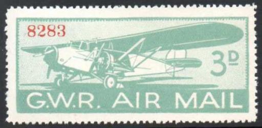Keywords: 1933 Great Western Railway Airmail Stamp.jpg en 1933 3 pence Great Western Railway Airmail stamp No 8283 www templarphilatelics co uk Great Western Railway 1933 PD-old Railway stamps Airmail stamps