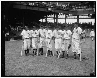 Keywords: 1937 Major League Baseball All-Star sluggers.jpg 1937 game at Griffith Stadium today Left to right Lou Gehrig Joe Cronin Bill Dickey Joe DiMaggio Charlie Gehringer Jimmie Foxx and Hank Greenberg 7/7/37 LOC-image hec 22989 http //hdl loc gov/loc pnp/hec 22989 Library of Congress Harris Ewing collection Harris Ewing 1937-07-07 No known restrictions on publication DC Past http //dcpast com/post/56967738737/1937-all-star-teams <gallery> File 1937 Major League Baseball All-Star sluggers jpg jpg File 1937 all stars crop FINAL tif tif of restored version File 1937 all stars crop FINAL jpg Restored version Cropped dust and scratches removed </gallery> PD-Harris-Ewing Lou Gehrig 1937 Major League Baseball All-Star Game Joe DiMaggio Black and white photographs of Major League Baseball in the 1930s Griffith Stadium Jimmie Foxx Hank Greenberg |