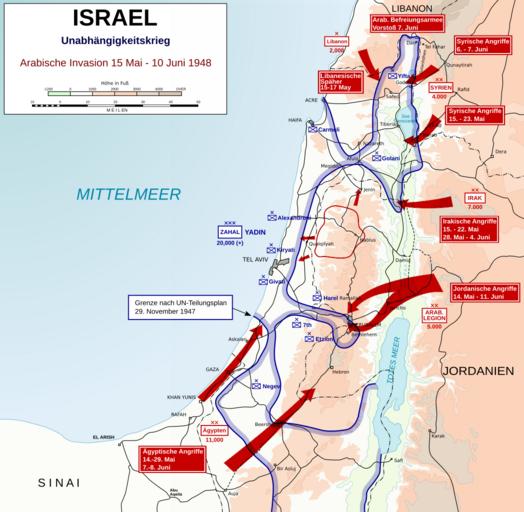 Keywords: 1948 Arab Israeli War - May 15-June 10 de.svg Unabhängigkeitskrieges Israels Palästinakrieg aufzeigt Die verwendeten Symbole sind NATO Militärsymbole en Map depicting military operations from 15th May 1948 to 10th June 1948 during Israeli War of Independence Symbols used in the map are NATO military symbols 2015-04-16 Arab_invasion_1948_-_GER PNG 1948_Arab_Israeli_War_-_May_15-June_10 svg Mr Edward J Krasnoborski and Mr Frank Martini Department of History U S Military Academy translation by Nasiruddin other versions cc-zero 1948 in Israel Maps of the history of Israel SVG maps showing history in German |