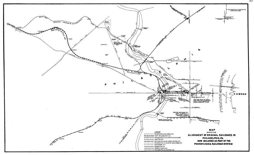 | Keywords: 1948 original railroads in Philadelphia.jpg Map of the original alignments of the railroads in Philadelphia that later became part of the Pennsylvania Railroad possibly missing a few very old alignments downtown From a 1948 PRR Board of Directors Inspection of Physical Property scanned on http //www railsandtrails com/Maps/PRR-Philadelphia/default htm and converted from 300 dpi djvu Relevant searches through http //www scils rutgers edu/~lesk/copyrenew html turn up nothing and there is no copyright information so public domain is very likely pd-old Pennsylvania Main Line of Public Works Maps of the Pennsylvania Railroad Railroad maps of Philadelphia Philadelphia Wilmington and Baltimore Railroad Broad and Prime Street Station |