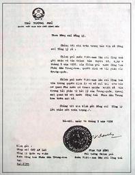 Keywords: 1958 diplomatic note from phamvandong to zhouenlai.jpg In 1958 the People's Republic of China issued a declaration defining its territorial waters which encompassed the Spratly and Paracel Islands North Vietnam's prime minister Pham Van Dong sent a diplomatic note to Zhou Enlai stating that The Government of the Democratic Republic of Vietnam respects this decision The diplomatic note was written on September 14 and was publicized on Nhan Dan newspaper Vietnam on September 22 1958 The content of Pham Van Dong's diplomatic note to Premier Zhou Enlai is as follows Comrade Prime Minister We have the honour to bring to your knowledge that the Government of the DRVN recognizes and supports the declaration dated 4th September 1958 of the Government of the PRC fixing the width of the Chinese territorial waters The Government of the DRVN respects this decision and will give instructions to its State bodies to respect the 12-mile width of the territorial waters of China in all their relations in the maritime field with the PRC I address to you comrade Prime Minister the assurance of my distinguished consideration collected by www spratlys org http //www spratlys org/collection/claims/vietnam/vietnam1 htm 1958-09-14 Vietnam Government PD-VietnamGov PD-PRC-exempt http //www mevietnam org/lanhtho-lanhhai/feer-dispute html and http //www fmprc gov cn/mfa_chn/zyxw_602251/t1163255 shtml Spratly Islands Relations of China and Vietnam |