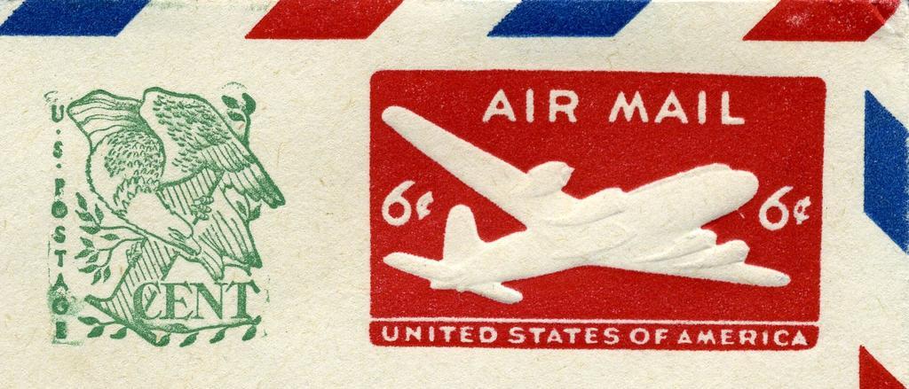 Keywords: 1958 US Airmail Stamped Envelope Indicium - 6+1 cents.jpg en 1958 revaluation from 6 to 7 cents denomination - U S airmail stamped envelope indicium 1958 U S Post Office Department scan of stamped envelope owned by contributor U S Post Office Department PD-USGov Cut squares of the United States |