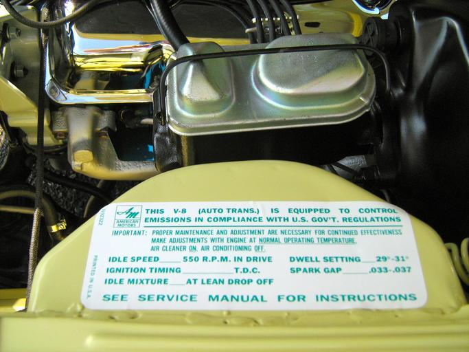 | Keywords: 1968 AMC AMX yellow 390 auto md-ed.jpg en Engine emissions sticker in the 1968 AMX a two-seat GT sport coupe made by American Motors Corporation AMC Finished in yellow with black stripes and all black interior This car has the 390 Go Package that included the 390 cu in 6 4 L 315 hp 235 kW V8 engine racing stripes power front disk brakes Twin-Grip differential Magnum 500 chrome wheels and many other high-performance components This car has the optional automatic transmission Rally Pac instruments and dual side exhaust pipes own 2010-09-25 CZmarlin ” Christopher Ziemnowicz releases all rights but a photo credit would be appreciated if this image is used anywhere other than Wikipedia Please leave a note at Wikipedia http //en wikipedia org/w/index php title User_talk CZmarlin action edit section new here Thank you thumb left Right side profile view thumb center Rear view thumb left Optional dual side pipes thumb center 390 emblem on rear side thumb left Detail of the AMX badge thumb center Rear side view thumb left The 390 AMX engine from right side thumb center The 390 AMX engine from left side thumb left Interior driver's side thumb center Interior dashboard and center console thumb upright left Go package over the top racing stripes thumb upright center Corporate logo mounted below rear window AMC 390 V8 engine AMC AMX Emission standards |