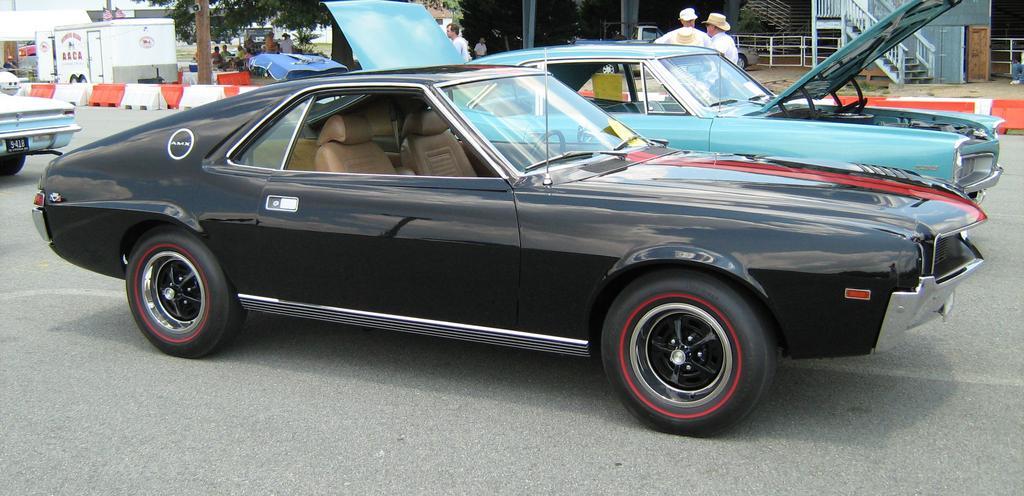 | Keywords: 1969 AMX black with red stripes VA s.jpg en 1969 AMX by American Motors Corporation AMC A two-seat GT-type sports coupe Finished in Classic Black with red stripes This car has the optional 390 Go Package that included the 390 cu in 6 4 L 315 hp 235 kW V8 engine racing stripes over the hood roof and trunk power disk brakes front Twin-Grip differential heavy-duty cooling including a seven-blade flex fan and shroud as well as a 140-mph 225-km/h speedometer and styled steel Magnum 500 wheels with bright trim rings The high-performance E70x14 red stripe wide-oval tires are correct factory standard equipment for this year own 2010-06-19 CZmarlin ” Christopher Ziemnowicz releases all rights but a photo credit would be appreciated if this image is used anywhere other than Wikipedia Please leave a note at Wikipedia http //en wikipedia org/w/index php title User_talk CZmarlin action edit section new here Thank you en I the copyright holder of this work hereby release it into the public domain This applies worldwide thumb left View of the rear thumb center View of the front thumb left View of the red racing stripes AMC AMX 1969 AMC automobiles Black coupes Automobiles facing right |