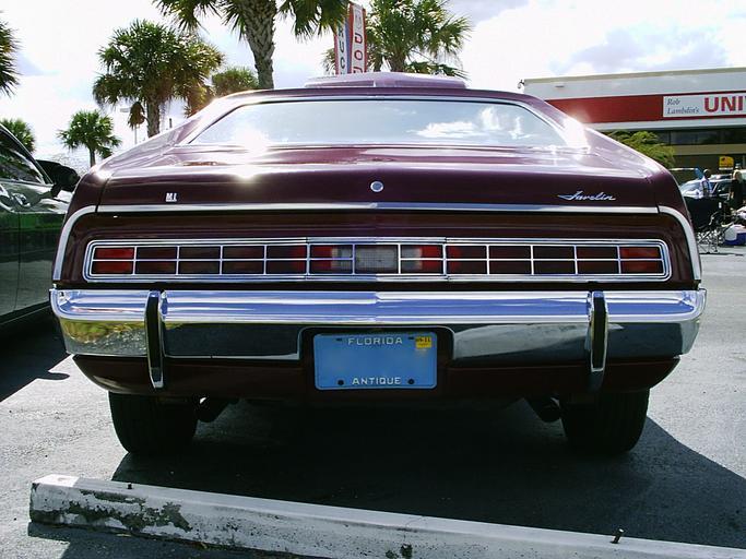 | Keywords: 1972 AMC Javelin SST burgundy FLtl.jpg Rear end of a 1972 Javelin SST coupe built by American Motors Corporation AMC a pony car finished in Sparkling Burgundy paint code D8 and equipped with AMC's 360 CID 5 9 L 2-barrel V8 engine in original driver condition Note the optional front and rear vertical bumper guards own 2010-03-07 CZmarlin ” Christopher Ziemnowicz releases all rights but a photo credit would be appreciated if this image is used anywhere other than Wikipedia Please leave a note at Wikipedia http //en wikipedia org/w/index php title User_talk CZmarlin action edit section new here Thank you I the copyright holder of this work hereby release it into the public domain This applies worldwide thumb left Front end of the 1972 Javelin SST thumb center Rear view of the 1972 AMC Javelin thumb left Instrument panel in this car thumb center Head on view of a 1972 Javelin thumb left Interior front seating in the 1972 AMC Javelin SST thumb center Unrestored AMC's 360 CID engine in this 1972 Javelin thumb left Detail of the Javelin's roof with spoiler -like shape at the rear and the twin canopy vinyl roof cover AMC Javelin Rear views of automobiles |