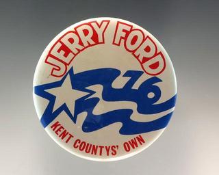 Keywords: 1976 campaign button b.JPG button that reads Jerry Ford / Kent County ™s Own used in Gerald R Ford ™s 1976 presidential campaign It features a blue shooting star design with 76 in the trail Ford born on July 14 1913 in Omaha Nebraska moved to Grand Rapids Kent County Michigan with his mother Dorothy Ayer Gardner as a young child to live in the home of her parents Levi Addison Gardner and Adele Augusta Ayer Ford attended Grand Rapids South High School represented Grand Rapids Michigan in the U S House of Representatives for 25 years and is burried in Grand Rapids Kent County 2012-08-08 Gerald R Ford Presidential Museum n/a Institution Institution Gerald R Ford Presidential Museum Accession Number 1988 1146 83 Dimensions 3 5 diameter Gerald R Ford Presidential Library and Museum-cooperation PD-USGov Uploaded with UploadWizard 1976 Campaign materials at the Gerald R Ford Presidential Museum Gerald Ford presidential campaign 1976 Political candidate campaign buttons of the United States 1976 in Michigan |