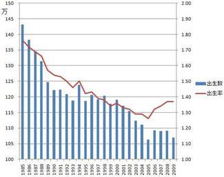 Keywords: 日本 出生数と合計特殊出生率の推移 1985年以降.jpg ja 日 の出生数と合計特殊出生率の推移 左が出生数で右が合計特殊出生率となっている 1947年以降の統計はあるが 近年では 第 次・第二次ベビーブームのような顕著な変化はほとんどなくなっているため 1985年以降だけをとり 近年の推移を分かりやすくしたグラフとなっている 誇張されたグラフともいえるので扱いには注意が必要 厚生労働 cosA 2011年4 3日 Cc-zero Methodology Demography Research |