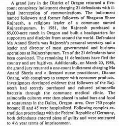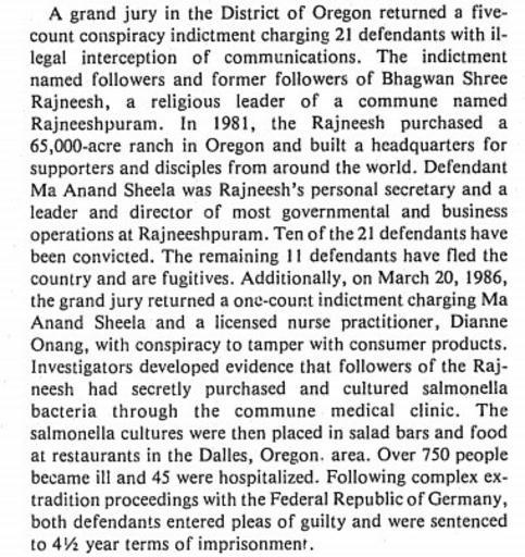 Keywords: 1986 US Attorney General report on Rajneesh movement crimes.jpg Annual Report of The Attorney General of the United States page 77 <br />A grand jury in the District of Oregon returned a five count conspiracy indictment charging 21 defendants with illegal interception of communications The indictment named followers and former followers of Bhagwan Shree Rajneesh a religious leader of a commune named Rajneeshpuram In 1981 the Rajneesh purchased a 65 000-acre ranch in Oregon and built a headquarters for supporters and disciples from around the world Defendant Ma Anand Sheela was Rajneesh's personal secretary and a leader and director of most governmental and business operations at Rajneeshpuram Ten of the 21 defendants have been convicted The remaining 11 defendants have fled the country and are fugitives Additionally on March 20 1986 the grand jury returned a one-count indictment charging Ma Anand Sheela and a licensed nurse practitioner Dianne Onang with conspiracy to tamper with consumer products Investigators developed evidence that followers of the Rajneesh had secretly purchased and cultured salmonella bacteria through the commune medical clinic The salmonella cultures were then placed in salad bars and food at restaurants in the Dalles Oregon area Over 750 people became ill and 45 were hospitalized Following complex extradition proceedings with the Federal Republic of Germany both defendants entered pleas of guilty and were sentenced to 4 1/2 year terms of imprisonment https //www ncjrs gov/pdffiles1/Digitization/126900NCJRS pdf www ncjrs gov 1986 Attorney General of the United States Edwin Meese PD-US-Gov File 1986 Annual Report of The Attorney General of The United States pdf<br />s 1986 US Attorney General report on Rajneesh movement crimes United States Department of Justice 1984 Rajneeshee bioterror attack PD-USGov |