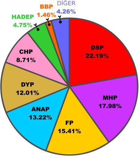 Keywords: 1999 TC Milletvekili Genel Seçimleri.svg I made this image as a response to the non-optimal quality and obvious SVG-ability of Image 1999 jpg It is actually created from the numeric data in Image 1999_TC_Milletvekili_Genel_Seçimleri_1 jpg as the percentages in the first image above don't add up to 100 they're nearly 4 short Note that as I don't understand Turkish the title and all names have been copied by me in good faith Any linguistic errors are not my fault - Pie-chart relating to a Turkish election 1999 Türkiye Cumhuriyeti Milletvekili Genel Seçimleri - Partilerin aldığı oy oranı Own 2008-05-17 Korax1214 100px Turkish general elections 1999 |
