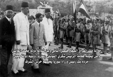 Keywords: 19 محمد بك العايش.jpg ar استقبال ملك العراق فيصل الثاني في دمشق عام 1948 من اليمين دولة رئيس مجلس النواب محمد العايش - جلالة الملك فيصل الثاني - فخامة الرئيس شكري القوتلي - دولة رئيس الوزراء جميل مردم بك 2013-12-19 00 00 52 www syrianhistory com موقع التاريخ السوري cc-by-sa-3 0 PD-Syria Mohammed Alayiesh Government ministers of Syria Baqqar Tribe |
