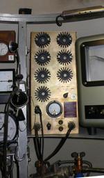 Keywords: 19 Bathyscaph Trieste German Museum Munich.jpg Bathyscaph Trieste German Museum Munich 1 Schalttafel für die Außenbeleuchtung 3 Scheinwerfer Quecksilberdampflampen an der Unterseite des Schwimmkörpers und 2 Glühlampen in Stahlgehäusen am Beobachtungsfenster der Tauchkugel und im Vorzimmer Ateliers de Constructions Mécaniques de Vevey S A Vevey Schweiz 2 Schalttafel zur Betätigung der Ballastschleusen und anderen Einrichtungen Ateliers de Constructions Mécaniques de Vevey S A Vevey Schweiz 3 Schalttafel für die Antriebsmotoren Ateliers de Constructions Mécaniques de Vevey S A Vevey Schweiz 4 Reservematerial 5 Chronometer des Fabrikats wie es auch bei den Ballonflügen in die Stratosphäre 1931 und 1932 von Auguste Piccard benutzt wurde Ateliers de Constructions Mécaniques de Vevey S A Vevey Schweiz 6 Totalisator zur Kontrolle der Ballastabgabe Mit zwei Sekunden-Zählwerken die nur laufen wenn der Strom der zugehörigen Ballastschleuse unterbrochen ist und Ballast abgegeben wird Da der Ballastausfluß jeder Schleuse ziemlich genau 10 kg je Sekunde beträgt kann man sofort erkennen wie viel Ballast verbraucht worden ist Langines Compagnie des Mantres Longines Francillon S A St Imier Schweiz 7 Manometer die zur Ermittlung der Tauchtiefe den Wasserdruck messen Haenni Jegenstorf Schweiz 8 Hochdruckventil 1200 kp/qcm Maschinenfabrik Burckhardt Aktiengesellschaft Basel Schweiz 9 Wasserdichter und explosionsgeschützter Fernsprechapparat für Batteriebetrieb mit einer Buchse im Schwimmkörper so dass nach dem Auftauchen eine Kabelverbindung mit Begleitfahrzeugen hergestellt und so beim Tauchen bis in geringe Tiefen aufrechterhalten werden kann Società Italiana Telecomunicazioni Siemens s p a Milano Italien 10 Automatische Filmkamera Bolex H 16 Reflex Paillard S A Ste Croix Schweiz 11 Photographische Kamera Exakta Ihagee Kamerawerk A G Dresden 12 Anzeigeinstrument des Nickelwiederstandsthermometers zur Messung der Temperatur des Tragebenzins Bosco Co S p a Torino Italien 13 Pendel zur Bestimmung der Trimmlage 14 Zink-Silber-Akkumulatoren zum Betrieb elektrischer Geräte der Ballastschleusen der Haltemagnete der Antriebsmotoren der Ventilatoren der Scheinwerfer Lampen und Innenbeleuchtung 330 Zellen zu je 1 5 Volt Electrona S A Boudry Schweiz 15 Pressluftflaschen zum Ausblasen des Wassers aus Vorzimmer und Einsteigeschacht AGA A G Pratteln-Zürich-Genf 16 Sauerstoff-Flaschen der Belüftungsanlage um den Sauerstoffgehalt der Atemluft in der Tauchkugel zu erneuern AGA A G Pratteln-Zürich-Genf 17 Natronpatronen Aus den Druckflaschen in einem Injektor strömender Sauerstoff saugt Raumluft durch diese drei Patronen Kohlendioxyd wird absorbiert und die gereinigte Luft gelangt gemischt mit Sauerstoff im Kreislauf in die Kabine zurück Drägerwerk Lübeck 18 Schalttafel Ateliers de Constructions Mécaniques de Vevey S A Vevey Schweiz 19 Unterwassertelefon nach Russel Lewis Laboratorium für Unterwasserschall New London Connecticut USA mit dem auch während des Tauchens eine Sprech- oder Signalverbindung mit dem Begleitschiff aufrechterhalten werden kann Die beim Sprechen auf das Mikrofon auftreffenden Schallwellen werden im Bereich von 300 bis 3000 Hertz in elektrische Schwingungen und nach Verstärkung zur à bertragung im Wasser in Unterschallschwingungen von 8387 bis 11087 Hertz umgewandelt Einseitenband-Modulation mit unterdrücktem Träger Beim Empfang findet der umgekehrte Vorgang statt 20 Echolot 21 Log zum messen der Vertikalgeschwindigkeit 22 Innenbeleuchtung mit 6 kleinen Glühlampen zur Beobachtung der Instrumente Sie beleuchten die weiß gestrichene Decke der Tauchkugel und sind gegen die Besatzung abgeschirmt um Blendwirkung zu vermeiden 23 Traggerüste für die Geräteausstattung Verformungen der Kugel durch Temperaturänderungen werden von Schraubfedern aufgenommen die in Bohrungen am oberen Ende der Stangen sitzen und einen Messingkolben gegen die Kugelwand drücken Ateliers de Constructions Mécaniques de Vevey S A Vevey Schweiz 24 Sitze 25 Fußboden der den Keller abdeckt Im Keller werden Alkalipatronen zur Erneuerung der Atemluft Druckgasflaschen zum Ausblasen des Einsteigschachtes nach einer Tauchfahrt und anderes Reservematerial aufbewahrt 26 Tauchkugel Fried Krupp Essen 27 Einsteigeluke 28 Hauptbeobachtungsfenster 29 Tonbandgerät Kudelski Enregistreur autonomes Nagra Paudex-Lausanne own Reinraum 2010-09-19 Trieste submarine 1953 |
