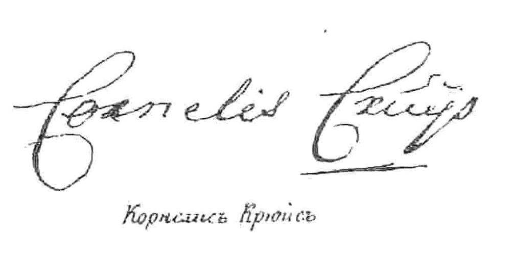 Keywords: Подпись Крюйса 1.jpg ru Подпись К К юйса Елагин С И Исто ия усского флота Пе иод Азовский печатается по ксе окопии издания 1864 года Во онеж Цент -Че нозём кн 1997 533 с ISBN 5-7458-0633-8 Елагин unknown PD-old Cornelius Cruys
