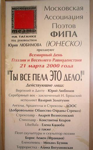 | Keywords: 1-й день поэзии UNESCO афиша Театр Таганка 2000.jpg en Aficha 1-j den poezii UNESCO 2000 Taganka teatr Lubimov ru Афиша 1-го дня поэзии UNESCO c моим участием 2000-моя собственность Константин Кед ов Konstantin kedrov moi disk D Konstantin kedrov Konstantin kedrov Константин Кед ов 2000г 21 ма та fail moi Я не воз ажаю п отив публикации и асп ост анением под этой лицензией Константин Кед ов Konstantin kedrov Konstantin kedrov <span class signature-talk >talk</span> 13 40 15 August 2009 UTC Theatre posters of Russia Konstantin Kedrov Taganka Theatre |