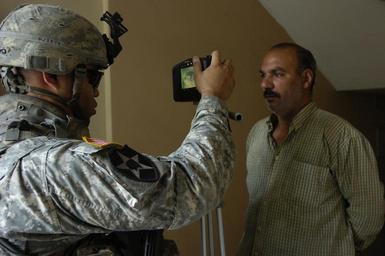 Keywords: 1-14 Cavalry troops take over operations on Haifa Street DVIDS44171.jpg en Staff Sgt Jason Jones with Troop A 1st Squadron 14th Cavalry Regiment attached to the 2nd Brigade Combat Team 1st Cavalry Division performs a retinal scan of a resident during a mission on Baghdad's Haifa Street May 8 Apocalypse Troop Soldiers were in the area conducting a census of the local population and asking them to fill out questionnaires about the availability of essential services like water trash removal and electricity 1999-11-30 Sgt Robert Yde https //www dvidshub net/image/44171 44171 2007-05-10 13 54 BAGHDAD IQ PD-USGov 1st Cavalry Division United States Images from DoD uploaded by Fæ |