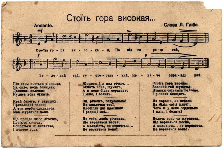 | Keywords: Стоїть гора високая (1).jpg en Postcard with lyrics and music of Ukrainian folk song uk Поштова листівка зі словами та музикою ук аїнської на одної пісні self-scanned Leonid Hlibov en folk music Глібов Леонід Іванович Леонід Глібов uk музика на одна 1917 Стоїть го а високая листівка-2 jpg Leonid Hlibov 1910s postcards Ukrainian folk songs 20th-century postcards of Russia PD-old-100 | ||||