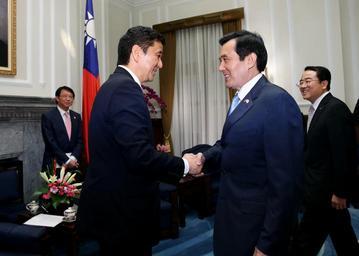 亞協李會長(右1)陪同馬總統(右2)接見日本自民黨「促進日本・臺灣經濟文化交流青年議員之會」(「日臺青年議聯」)會長岸信夫(左2)眾議員(總統府提供).jpg (3150x2250)