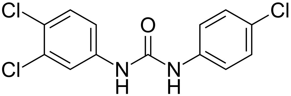 | Keywords: 1-(4-chlorophenyl)-3-(3,4-dichlorophenyl)urea 200.svg validSVG Structure of 1- 4-chlorophenyl -3- 3 4-dichlorophenyl urea Struktur von 1- 4-Chlorphenyl -3- 3 4-dichlorphenyl -harnstoff Own 2014-04-04 Emeldir <span class signature-talk >talk</span> Chemical structure verified https //upload wikimedia org/wikipedia/commons/7/77/1- 284-chlorophenyl 29-3- 283 2C4-dichlorophenyl 29urea_200 svg 1S/C13H9Cl3N2O/c14-8-1-3-9 4-2-8 17-13 19 18-10-5-6-11 15 12 16 7-10/h1-7H H2 17 18 19 ICUTUKXCWQYESQ-UHFFFAOYSA-N 101-20-2 202-924-1 Synonyms <small>1- 3' 4'-dichlorophenyl -3- 4'-chlorophenyl urea 1- 4-Chloro-phenyl -3- 3 4-dichloro-phenyl -urea 1- 4-Chlorophenyl -3- 3 4-dichlorophenyl urea 3 4 4'-Trichlorocarbanilide 3 4 4'-Trichlorocarbonanilide 3 4 4'-trichlorodiphenylurea 3 4 4'-Trichlorodiphenylurea 3 4 4'-Triclocarban 3 4 4-Trichlorocarbanilide Carbanilide 3 4 4'-trichloro- 8CI CP 78416 cusiter Cusiter Cutisan cutisan ENT 26925 Genoface genoface N- 3 4-Dichlorophenyl -N'- 4-chlorophenyl urea N- 3 4-dichlorophenyl -N'- 4-chlorophenyl urea N- 3 4-Dichlorophenyl -N'- 4-chlorophenyl urea N- 4-chlorophenyl -N'- 3 4-dichlorophenyl urea N- 4-Chlorophenyl -N- 3 4-dichlorophenyl -Urea NSC-72005 Procutene procutene Solubacter TCC Trichlorocarbanilide Triclocarban triclocarban Triclocarban USAN Triclocarbán Triclorocarbanilide Trilocarban Urea N- 4-chlorophenyl -N'- 3 4-dichlorophenyl - 9CI WLN GR DMVMR CG DG</small> PD-chem Carbamides Monochlorobenzenes Dichlorobenzenes N-substituted anilides |