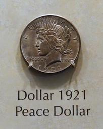 | Keywords: 1 Dollar, United States, 1921 - National Museum of American History - DSC00258.jpg en Exhibit in the National Museum of American History Washington DC USA Photography was permitted in the museum without restriction 2015-03-27 11 36 35 own Daderot other versions cc-zero Coins in the National Museum of American History Peace dollar | ||||