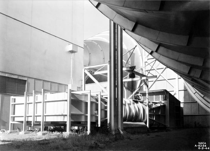 | Keywords: blackandwhite monochrome black and white (A-6244): The 1 x 3.5-Foot High-Speed Tunnel, located in the16-Foot High-Speed Tunnel’s central courtyard, was dwarfed by its host. Note the tunnel’s simple construction, the hoist frame over the circular fan section (with a man kneeling on top), and the air-exchange tower to the right of the fan section. (A-6244): The 1 x 3.5-Foot High-Speed Tunnel, located in the16-Foot High-Speed Tunnel’s central courtyard, was dwarfed by its host. Note the tunnel’s simple construction, the hoist frame over the circular fan section (with a man kneeling on top), and the air-exchange tower to the right of the fan section. |
