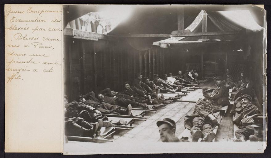 Keywords: photo border Evacuation des blessés par eau. Blessés ramenés à Paris, dans une péniche aménagée à cet effet. Evacuation des blessés par eau. Blessés ramenés à Paris, dans une péniche aménagée à cet effet.