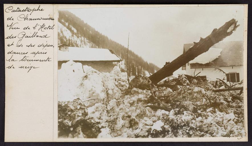 Keywords: photo border Catastrophe de Chamonix. Vue de l'hôtel des Gailland et de ses dépendances après la tourmente de neige. Catastrophe de Chamonix. Vue de l'hôtel des Gailland et de ses dépendances après la tourmente de neige.