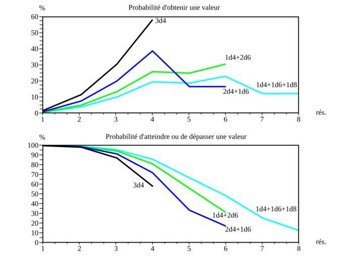 Keywords: 1d choisi parmi 3 differents.svg en Three dice possibly different e g 1d4 1d6 and 1d8 are thrown and only the best result is kept system used in the Usagi Yojimbo roleplaying game The top figure shows the probability to get a value The bottom figure shows the probability to have a result equal or better than a value fr On jette trois dés pouvant être différents par exemple 1d4 1d6 et 1d8 et on retient le meilleur score système utilisé dans le jeu de rôle Usagi Yojimbo Le graphique du haut indique la probabilité de faire une valeur Le graphique du bas indique la probabilité d'atteindre ou de dépasser une valeur own from the original raster File 1d choisi parmi 3 differents png by Christophe Dang Ngoc Chan Cdang <span class signature-talk >talk</span> MHz`as subsets File 1d_choisi_parmi_3_differents_fonction_de_masse svg File 1d_choisi_parmi_3_differents_fonction_de_densite svg Dice probability