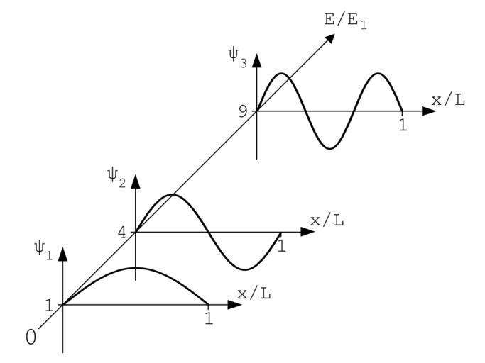 Keywords: 1D Wavefunctions with Energies.svg Diagram showing the wavefunctions of the first 3 energy states in a 1D quantum well of width L Own Drawings done in Inkscape 12/02/07 inductiveload image 1D_Probability_Densities_with_Energies svg Diagram showing the proability density function of the first 3 energy states in a 1D quantum well of width L 1D infinite square wells |