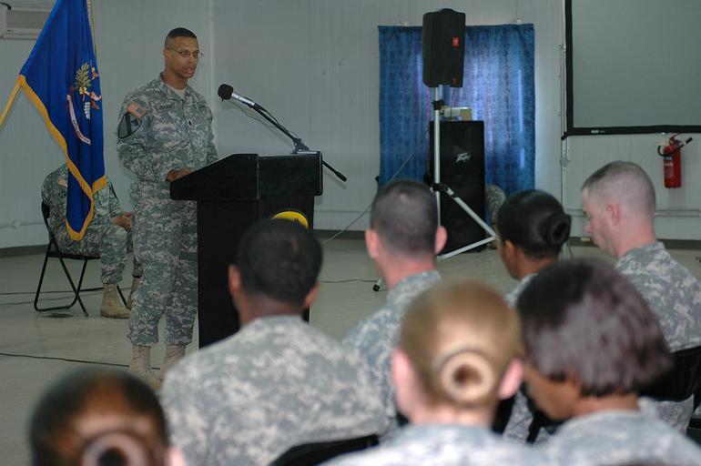 Keywords: 1st ACB Observes Black History Month DVIDS36452.jpg en Soldiers of the 1st Air Cavalry Brigade 1st Cavalry Division listen as Baton Rouge La native Lt Col Charles Dalcourt Jr speaks about African Americans in the U S military during a Black History Month program at Camp Taji Iraq Feb 15 2004-12-31 Sgt 1st Class Rick Emert https //www dvidshub net/image/36452 36452 2007-02-19 10 39 TAJI IQ PD-USGov Black History Month at Fort Hood Texas Camp Taji Black History Month Images from DoD uploaded by Fæ