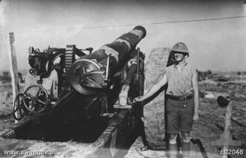 Keywords: 1st Aust Siege Bty (AWM E02048).jpg AWM Caption Western Front Western Front Belgium Ypres Area Ypres A camouflaged 8 inch No 2 gun of the 1st Australian Siege Battery at Birr Cross Roads http //deepthought hass adfa edu au 8080/showPerson pid 304583 518 Gunner Harold Alexander Triggs later killed in action on 5 July 1918 near Lamotte in Nieppe Forest is standing by awaiting the order to fire during the ranging of the battery on 26 September 1917 prior to the attack carried out on Polygon Wood on 28 September 1917 The dial sight has been removed in order to save damage on shock of discharge This is an original Paget Plate negative The same image is available in colour and is held at P03631 169 A similar image is held at E02048A E02048 1917-09-26 Hurley James Francis Frank Copyright expired - public domain PD-AustraliaGov world War I forces of Australia in Belgium BL 8 inch Howitzer Mk VI - VIII World War I Photographs by Frank Hurley Battle of Polygon Wood Black and white photographs of guns |