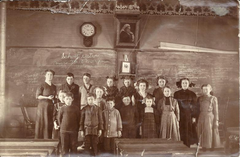 Keywords: children 1910s women clothes schools Group photograph of Flossie Hall and her students at School Section No. 10, Mariposa, Victoria County. The photograph was taken on March 28, 1912. It shows six boys and ten girls, standing in front of the blackboard of the school. Above their heads is a portrait of Queen Victoria and a clock, showing that the time was 2.50pm. The photograph forms part of the Hall Family fonds, donated to Deseronto Archives by Kathryn Sondheim, Flossie's granddaughter, in 2003. Group photograph of Flossie Hall and her students at School Section No. 10, Mariposa, Victoria County. The photograph was taken on March 28, 1912. It shows six boys and ten girls, standing in front of the blackboard of the school. Above their heads is a portrait of Queen Victoria and a clock, showing that the time was 2.50pm. The photograph forms part of the Hall Family fonds, donated to Deseronto Archives by Kathryn Sondheim, Flossie's granddaughter, in 2003. |