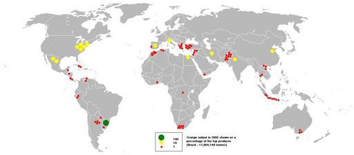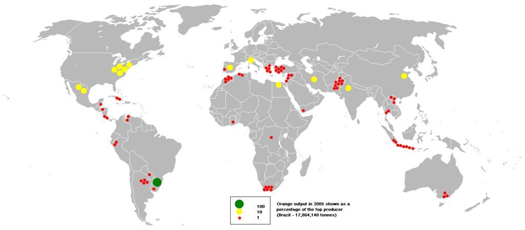 MAKE A MEME View Large Image 2005orange.PNG This bubble map shows the global distribution of orange output in 2005 as a percentage of the top producer Brazil - 17 864 140 tonnes This map is consistent with incomplete set of data too as long as the top producer is known ...