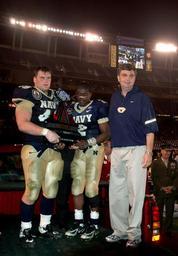 Keywords: 2006 Poinsettia Bowl Trophy Navy.jpg U S Naval Academy defensive end DE Jeremy Chase left Quarterback QB Lamar Owens center and head football coach Paul Johnson receive the Poinsettia Bowl trophy after defeating Colorado State 51-30 The college teams played in the inaugural Poinsettia Bowl at Qualcomm Stadium in San Diego http //www navy mil/view_image asp id 30839 2005-12-22 Journalist 2nd Class Zack Baddorf PD-USGov-Military-Navy 2005 Poinsettia Bowl Lamar S Owens Jr |