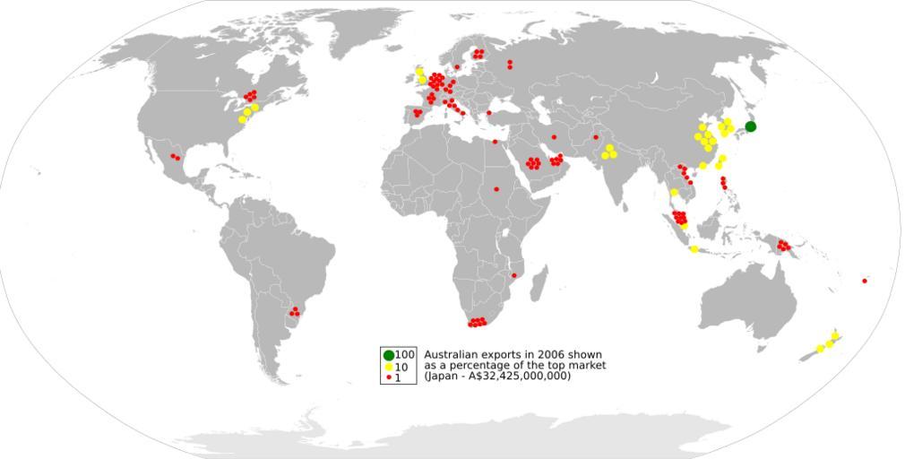 Keywords: 2006Australian exports.svg bubble map shows the global distribution of Australian exports in 2006 as a percentage of the top market Japan - A 32 425 000 000 This map is consistent with incomplete set of data too as long as the top market is known It resolves the accessibility issues faced by colour-coded maps that may not be properly rendered in old computer screens Own work Derived from 45px File 2006Australian exports PNG by Anwar saadat cflm <small> talk </small> 2009-08-28 thumb left Original PNG version Economic charts of Australia Trade maps of the world Maps of the world indicating regions International relations maps of Australia Bubble maps |