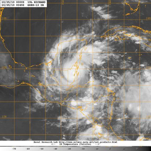 | Keywords: 20101025.0045.goes13.x.ir1km bw.19LRICHARD.80kts-981mb-172N-882W.100pc.jpg This is an infrared image of Hurricane Richard at peak intensity and making landfall on Belize taken by the GOES-13 spacecraft Leading up to this photograph Richard had strengthened rapidly and radar imagery showed a closed eyewall In this photo Richard has windspeeds of 90 mph and a minimum pressure of 981 mbar Eventually Richard dissipated in the Bay of Campeche Mouse over the image for information http //199 9 2 143/tcdat/tc10/ATL/19L RICHARD/ir/geo/1km_bw/ 2010-10-25 GOES-13; US Navy PD-USGov-Military-Navy ImageNote 1 666 119 357 203 1024 1024 2 Cuba ImageNoteEnd 1 ImageNote 2 391 329 242 276 1024 1024 2 Hurricane Richard ImageNoteEnd 2 ImageNote 3 806 2 201 116 1024 1024 2 South Florida ImageNoteEnd 3 ImageNote 4 314 486 174 227 1024 1024 2 Guatemala ImageNoteEnd 4 ImageNote 5 565 323 29 24 1024 1024 2 Cozumel ImageNoteEnd 5 ImageNote 6 427 654 171 94 1024 1024 2 El Salvador ImageNoteEnd 6 ImageNote 7 464 577 328 125 1024 1024 2 Honduras ImageNoteEnd 7 ImageNote 8 502 643 311 227 1024 1024 2 Nicaragua ImageNoteEnd 8 ImageNote 9 836 341 150 101 1024 1024 2 Cayman Islands ImageNoteEnd 9 ImageNote 10 614 853 237 102 1024 1024 2 Costa Rica ImageNoteEnd 10 ImageNote 11 2 2 321 49 1024 1024 2 Date and Subject Information ImageNoteEnd 11 ImageNote 12 2 956 1021 34 1024 1024 2 Information ImageNoteEnd 12 ImageNote 13 2 997 1021 22 1024 1024 2 Infrared Legend ImageNoteEnd 13 ImageNote 14 459 445 65 114 1024 1024 2 Belize ImageNoteEnd 14 ImageNote 15 7 585 309 370 1024 1024 2 Pacific Ocean ImageNoteEnd 15 ImageNote 16 290 683 360 270 1024 1024 2 Pacific Ocean ImageNoteEnd 16 ImageNote 17 585 270 432 338 1024 1024 2 Caribbean Sea ImageNoteEnd 17 ImageNote 18 7 212 384 237 1024 1024 2 Bay of Campeche ImageNoteEnd 18 ImageNote 19 783 616 237 311 1024 1024 2 Caribbean Sea ImageNoteEnd 19 ImageNote 20 20 53 787 162 1024 1024 2 Gulf of Mexico ImageNoteEnd 20 ImageNote 21 9 259 302 401 1024 1024 2 Mexico ImageNoteEnd 21 ImageNote 22 370 266 179 203 1024 1024 2 Yucatan Peninsula ImageNoteEnd 22 Hurricane Richard 2010 |